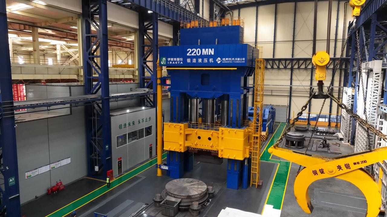 2025年9月25日,全球最大2.2萬噸自由鍛壓機(jī)今天在濟(jì)南市章丘區(qū)投產(chǎn),項目從開工到投產(chǎn)僅用12個月時間。項目占地126畝,建筑面積6萬平方米。鍛壓機(jī)由伊萊特能源裝備股份有限公司與通用技術(shù)天鍛公司共同研發(fā)制造,其最大能力220MN,能夠滿足各類整體超大型部件的鍛造需求。